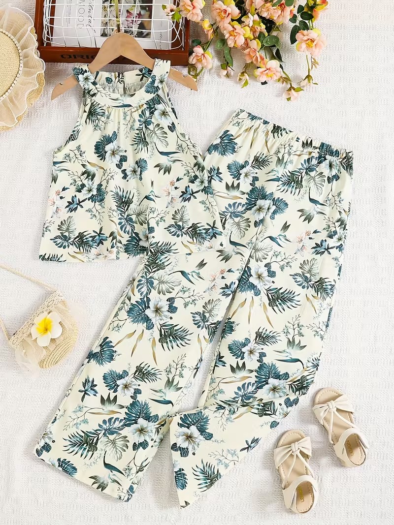 Girls Floral Print Halter Neck Top & Wide Leg Pants Set