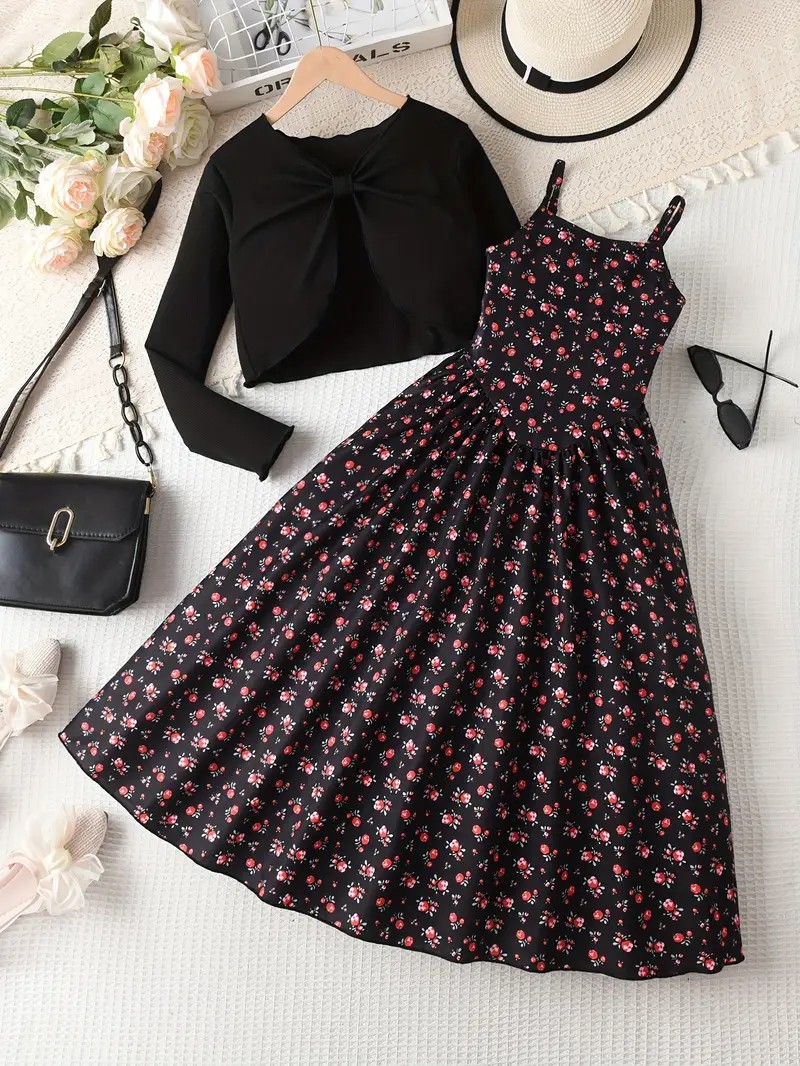 Girls Floral Print Sleeveless Dress & Mock Neck Top Set