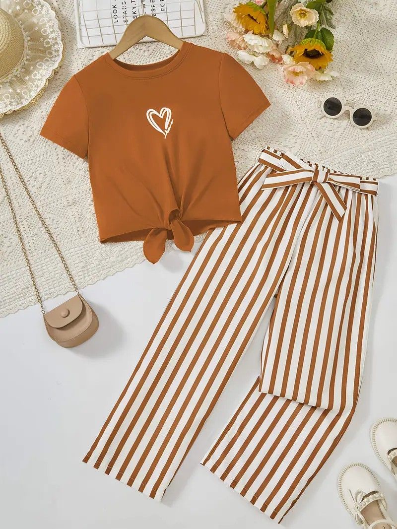 Girls Heart Print Tie Front Top & Striped Pants 2 – Piece Set