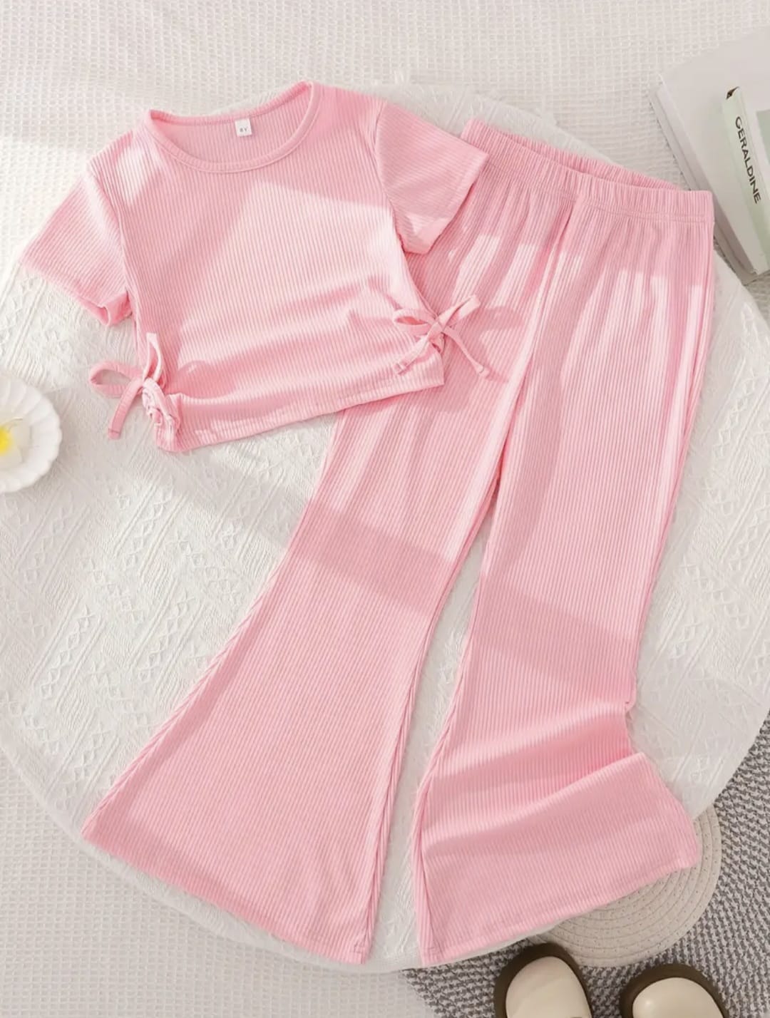 Girls Pink Drawstring Top & Flare Pants Set