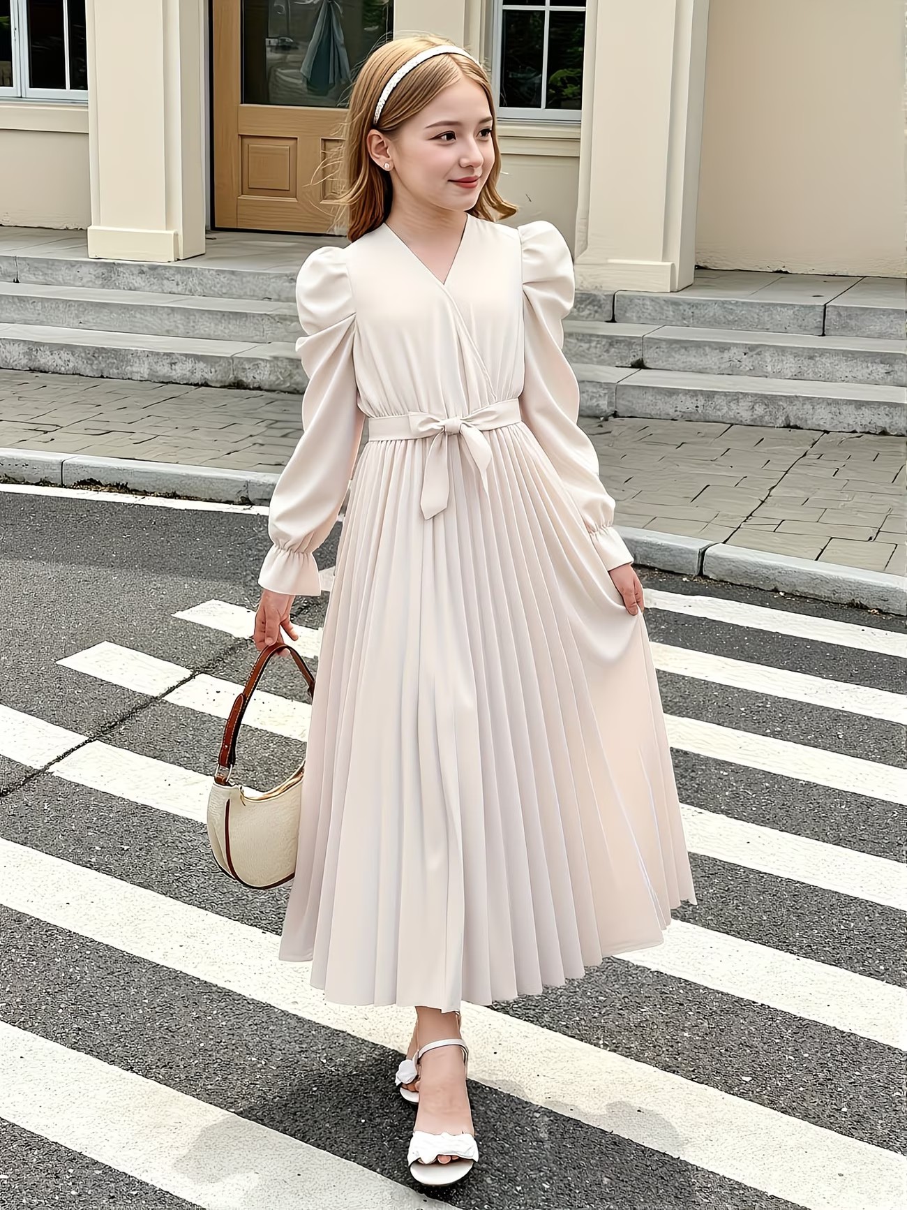 Girls V- Neck Pink Nude Sold Color Long Sleeve Dress