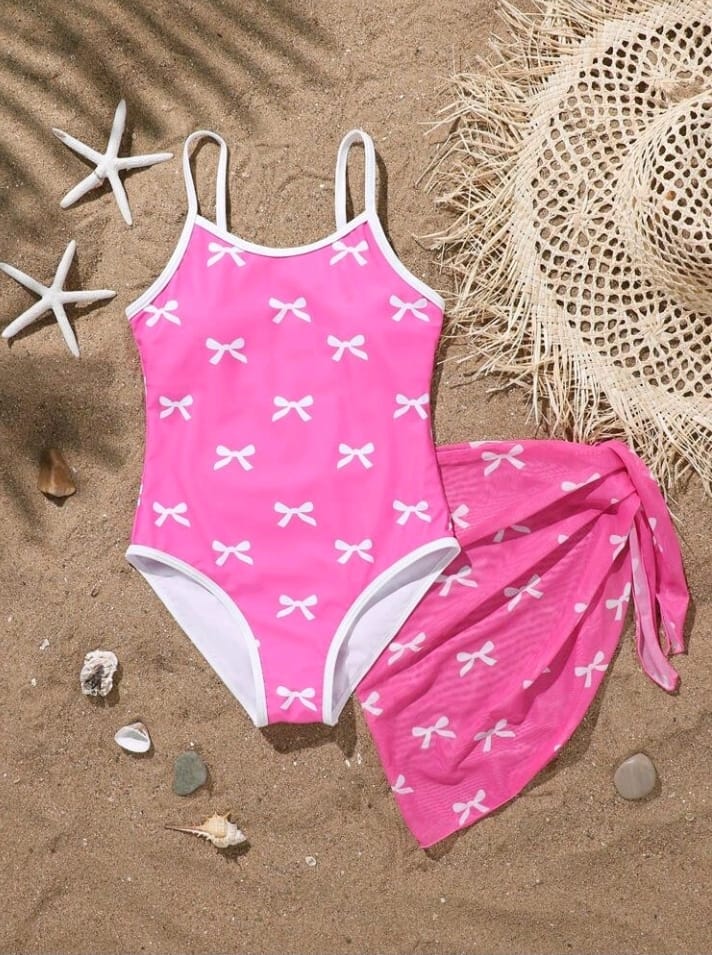 Shein Girls Pink Bow Print Swimwear & Wrap