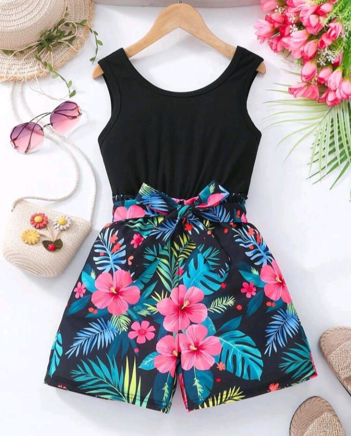 Shein Youth Girls Black Tropical Print Short Romper