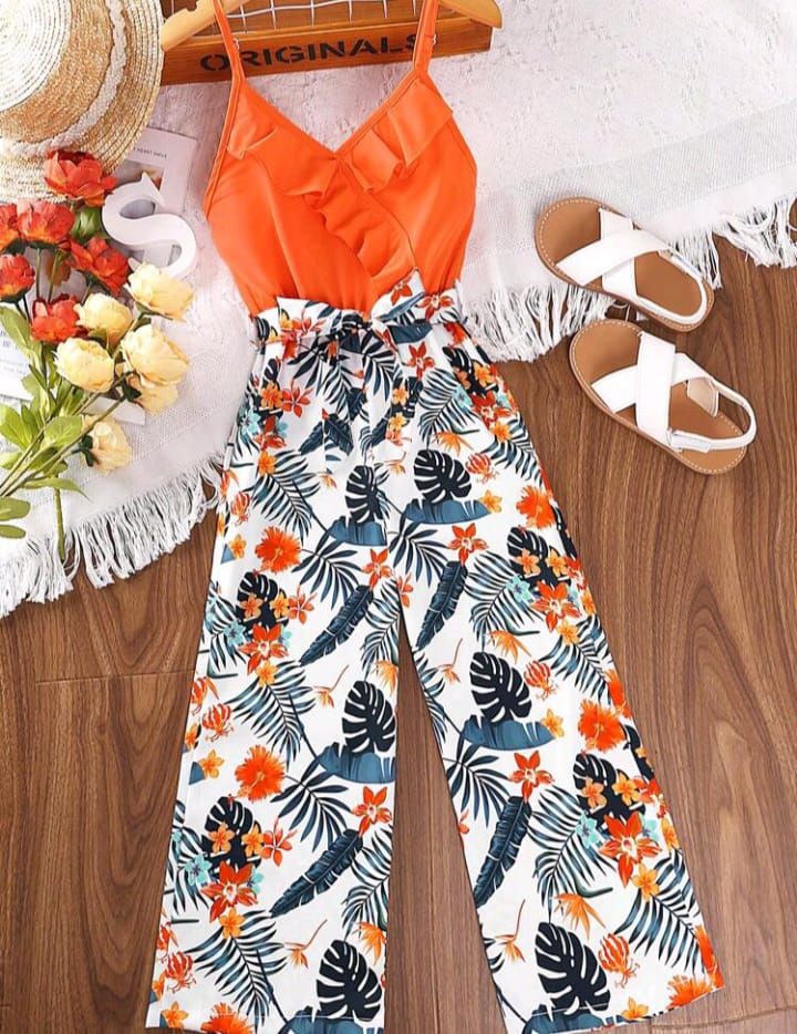 Shein Youth Girls Orange Tropical Print Long Romper